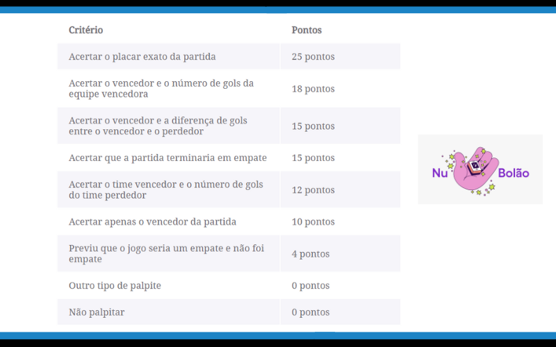Confira a seguir qual é o número de pontos por cada palpite que o Nubank dá no NuBolão!