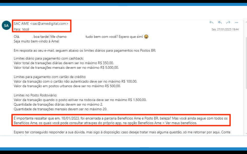 O cliente posteriormente entrou em contato com o SAC da Ame Digital, via e-mail, onde foi notificado que a Ame encerrou a parceria de cashback com os postos Petrobras no dia 18 de janeiro de 2023, como mostramos na imagem abaixo.