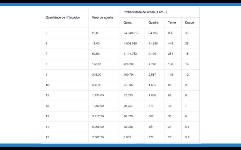 Confira a seguir uma tabela que explica o valor da aposta conforme a quantidade de números marcados e as probabilidades de ganhar!
