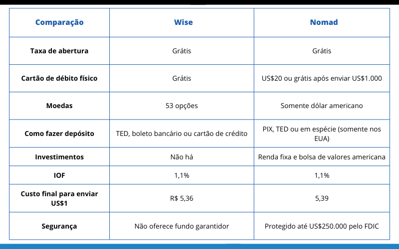 Além disso, tanto a Wise quanto a Nomad são opções práticas e mais baratas para realizar compras internacionais, viajar e receber em outras moedas.